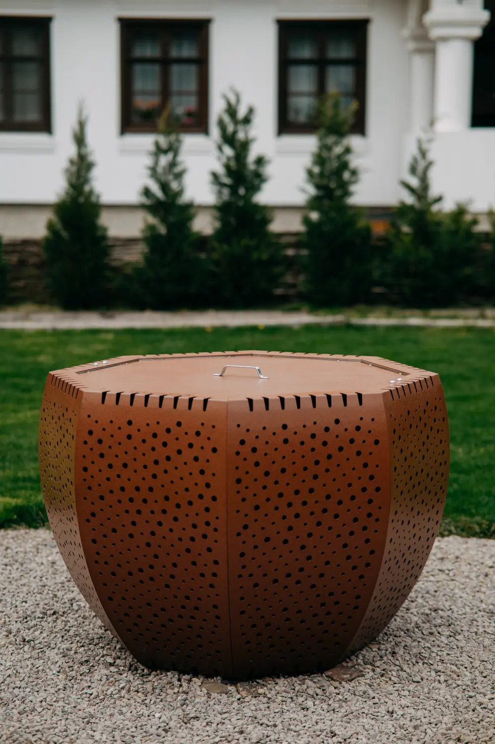Its outer casing is adorned with irregular perforations through which the integrated LEDs emit a star-like light show when viewed from a distance, creating a magical ambiance in the evening.